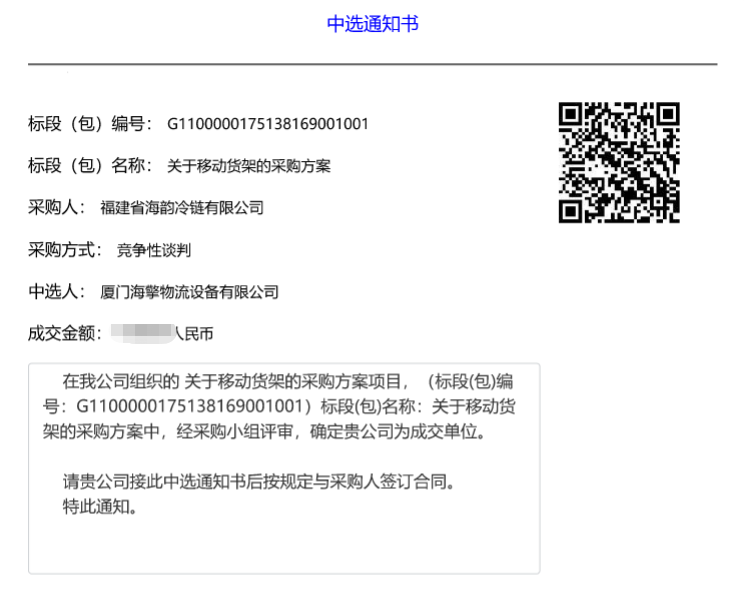 喜訊!公司已中標(biāo)海韻冷鏈堆垛架采購項(xiàng)目